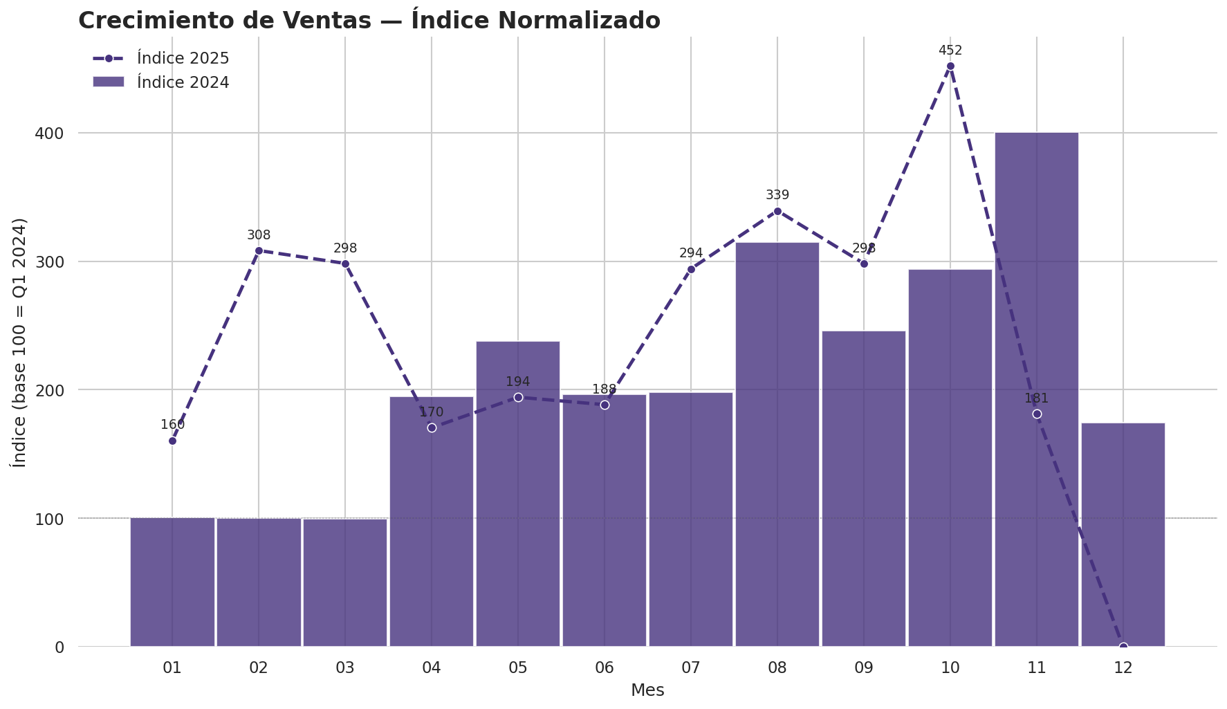 Índice de ventas normalizado (base 100 = Q1 2024) · Fuente: CRM interno
